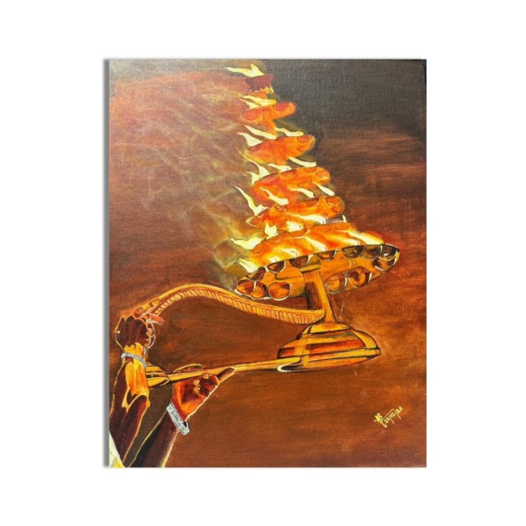 A powerful depiction of a ceremonial aarti lamp, symbolizing devotion, purity, and the eternal light of faith.