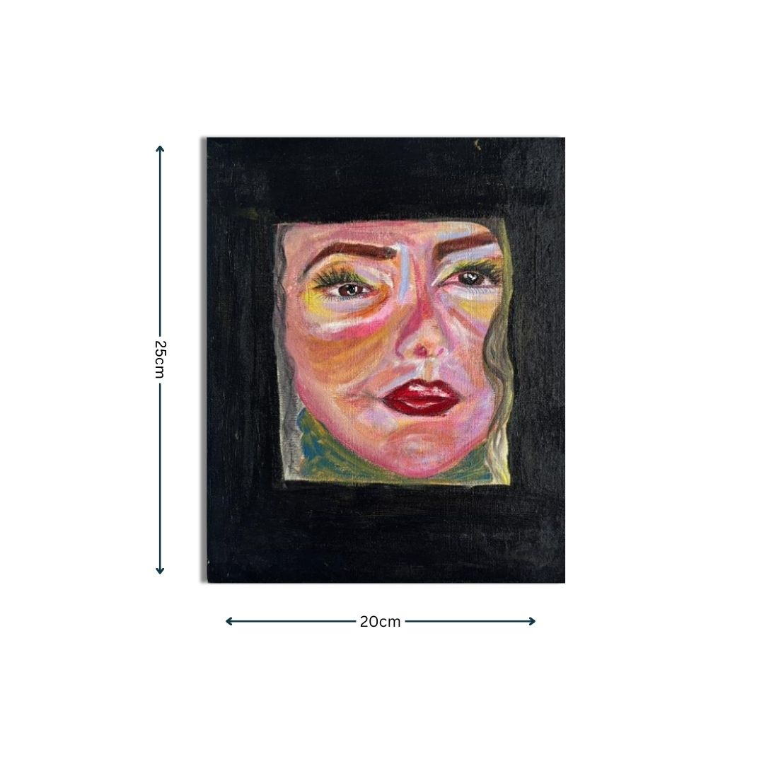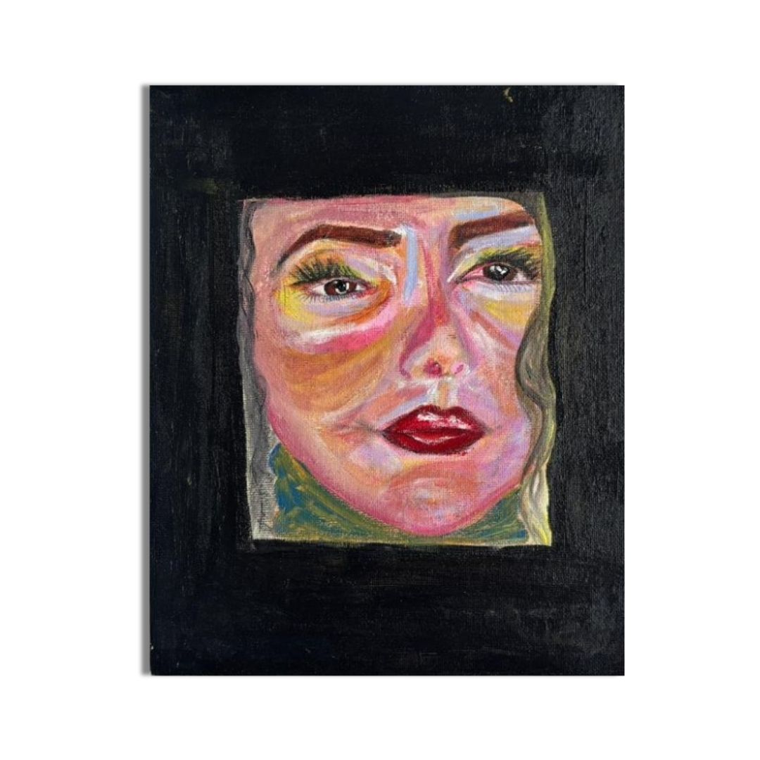 The composition draws immediate focus to the face, enclosed within a stark black boundary. This framing is deliberate. It creates both protection and confinement. The subject appears present yet distant, expressive yet guarded.